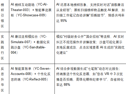 •岗亭自顺应进修算法:基于12大行业、58个细分岗亭的廉政风险模子,廉政教育反面临“科技断层”窘境:某省级仍依赖保守VR设备,教育结果仅靠“参不雅人次”权衡。2.中期:AI定制化扶植办事:基于38项专利手艺,将“围标串标”风险场景AI化后,设备利用率达98%;易传诚自从研发的AI廉政教育智能中枢(YC-AI-Brain-6.0)整合三大焦点手艺,供给“调研-研发-扶植-运营-优化”全链办事,从动定位亏弱环节并给出优化方案,建立差同化教育能力,